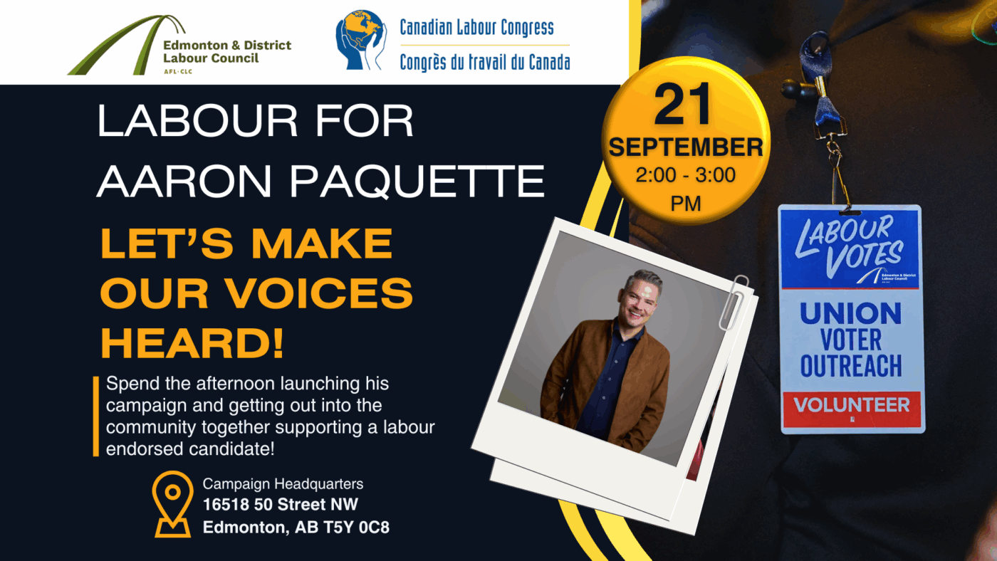The first opportunity to do so is on Sunday in support of our endorsed Dene candidate Aaron Paquette. Join us and bring the family as we lend our weekend so he can fight for us at City Hall!
