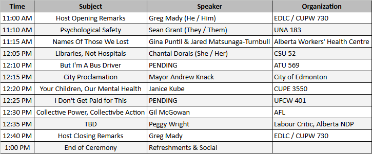 Every year we gather in Grant Notley Park at the Broken Families Monument to honour those who have lost their lives as a result of their jobs in the preceding year. This year our theme is Psychological Safety – The Invisible Threat where we will discuss the broad and long reaching impacts of psychological safety and the lack of supports in jobs that are getting increasingly dangerous for the mental health of workers.