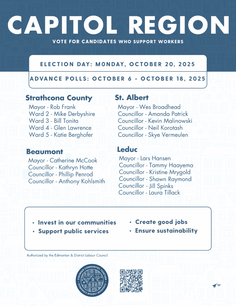 We have received a lot of feedback from affiliates, delegates and supporters asking when we will be releasing our endorsements for cities in the capital region. As we continue to grow our presence outside of Edmonton we are proud to announce the following list of endorsed candidates in our neighbouring communities!